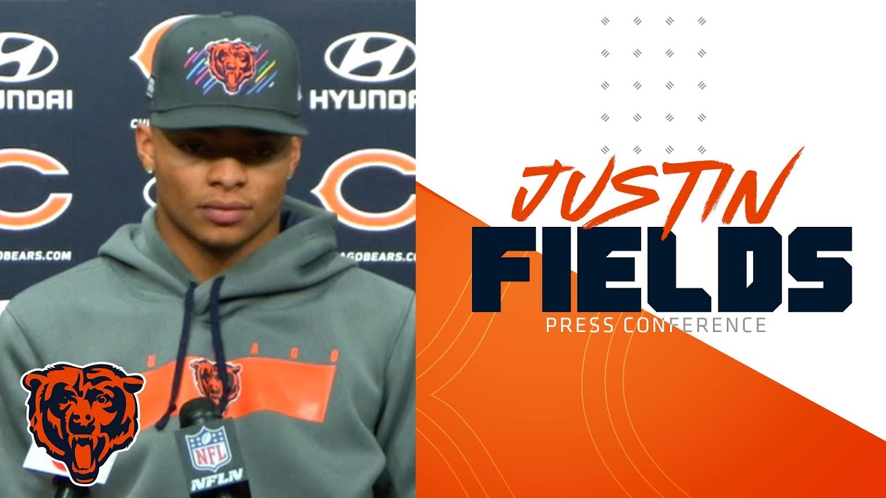 Quarterback Justin Fields addresses the media Thursday at Halas Hall.